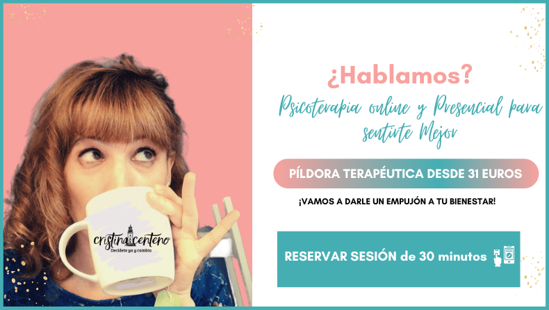 Comparte un mensajito con nosotros a través de info@cristinacenteno.com y, ya sea en formato online o presencial (tanto en Tenerife como en Madrid), los profesionales de Decídete y Cambia nos pondremos el mono de trabajo contigo para mejorar los hábitos (cognitivo – emocionales – conductuales) implicados en el cuadro de depresión de tu ser querido.